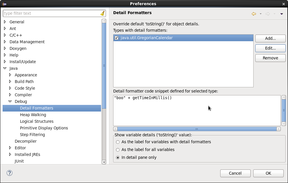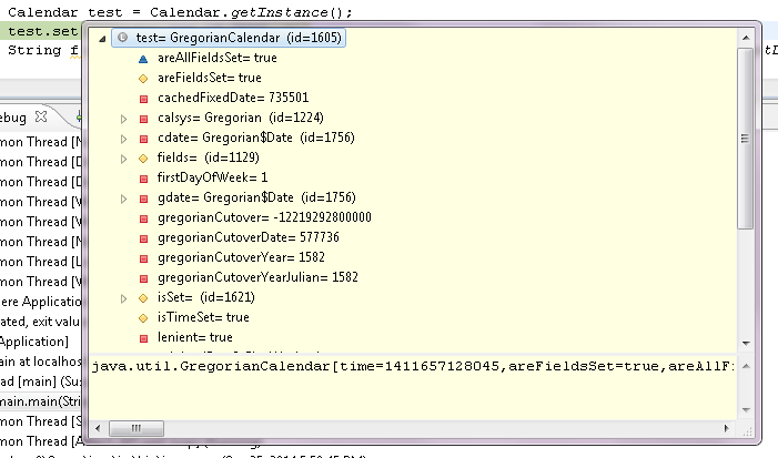 当我在Eclipse中定义断点时,我可以通过鼠标悬停在它上面来检查变量的值。此外,我还可以切换到Debug透视图,并执行更高级的任务,比如编写自定义表达式和更改变量的值。我想知道是否可以在当鼠标悬停在变量上时打开的窗口中执行这些任务?例如,编写自定义表达式将Java日历对象的值动态转换为人类可读的格式,等等。