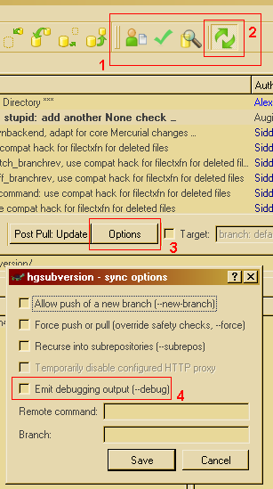 Sync Toolbar (1) - Synchronize按钮(2) - Options按钮(3) -窗口(4)中的Emit debugging output复选框