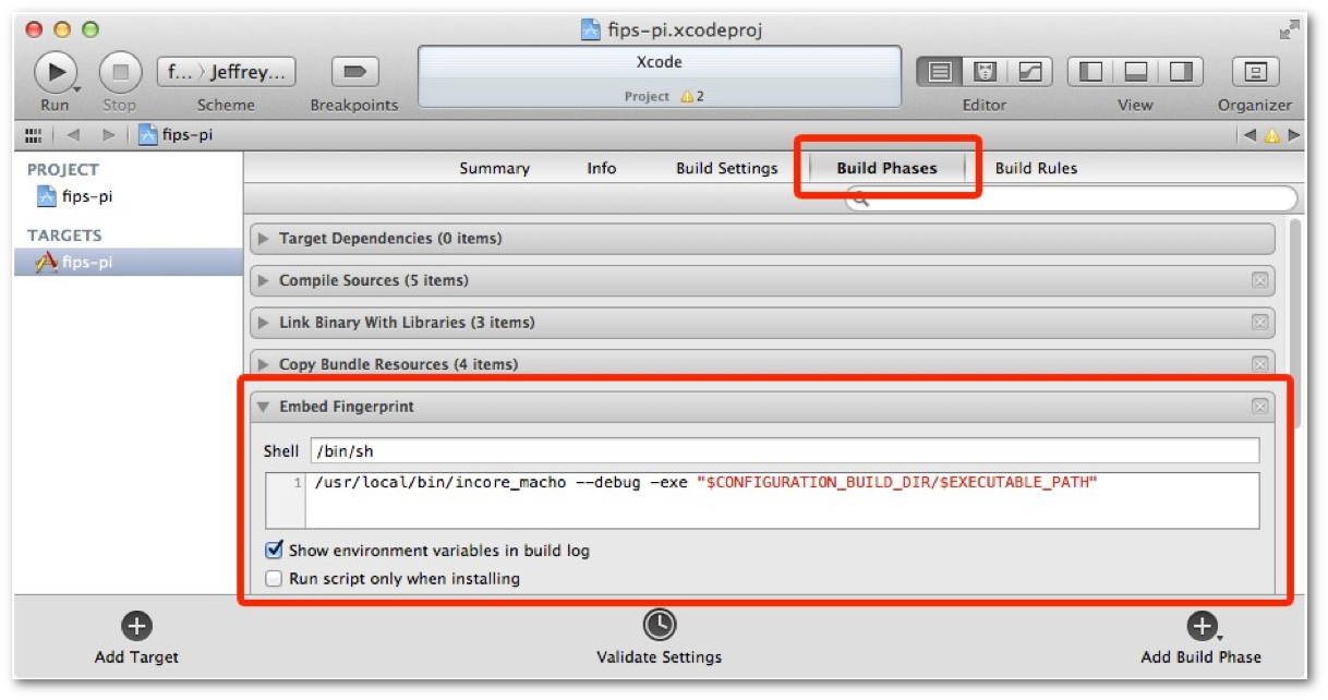 在OpenSSL示例中,在Taget的构建阶段(它在项目级别上不可用)下有一个名为Embed 的定制构建步骤。您可以在FIPS对象模块的OpenSSL用户指南2.0附录E.2中找到示例。截图转载如下: