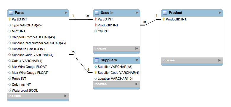 我现在正在设计的数据库中有上面的表,在MySQL中。该数据库的主要目的是为数据库创建材料清单,并加强对这些材料清单的修订控制。