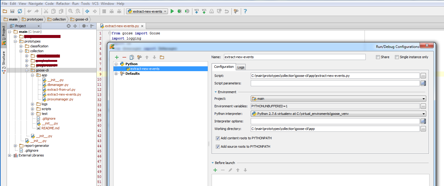 我试着和Python-鹅提取器一起工作。我安装了virtualenv,并按照安装说明执行。当从PyCharm运行时,一切都很好。