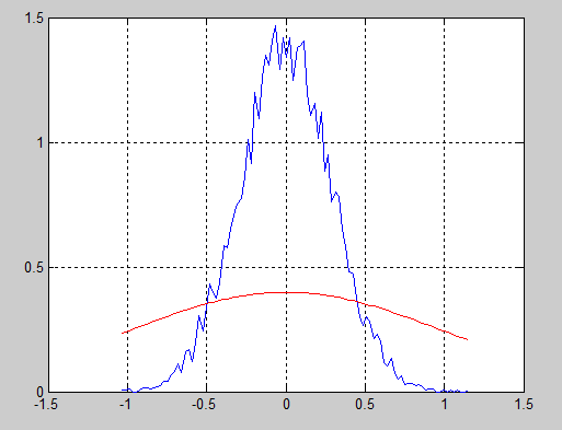 plot(x,normpdf(x,0,1),'r');但这根本不符合实际情况。我在这里错过了什么?我现在的情节是这样的。蓝色是实际的,红色是理论的。