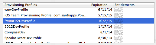 当我为它创建的配置配置文件被下载到Xcode中时,我进入Xcode中的首选项,查看我的帐户的配置配置文件,我可以看到配置文件的名称和过期日期,然后有一些权利图标。但是我用HealthKit创建的配置文件没有任何图标,只有2个默认图标,这是正常的: