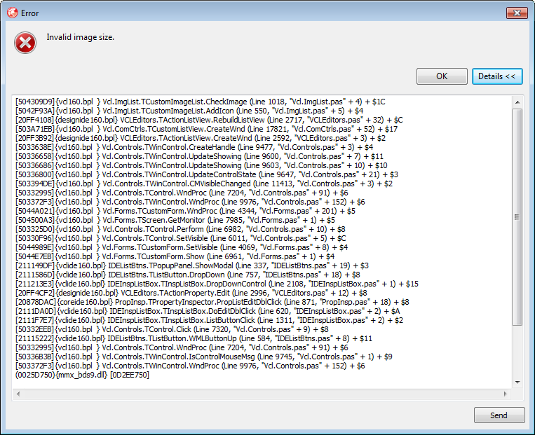 在表单中,具有12x12图像的TImageList链接到TActionManager。在窗体上选择TBitBtn的“Action”属性时,会显示“无效图像大小”错误。