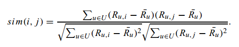 调整后的余弦相似度通过从每个同级对中减去相应的用户平均值来弥补这一缺点。形式上,使用该方案给出了项目i和j之间的相似性。