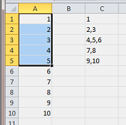 使用A1:A5中的原始值,选择A1:A5。此宏将值读入变体数组中。由于读取的性质,在将值读入变体时,需要将其转换。然后循环遍历每个值,并尝试将逗号处的每个值拆分为两个或多个值。如果它找不到逗号,它只会在下一个可用单元格中使用原始单元格的值。如果它分割了原始值,它会循环其中的每一个,将它们放入下一个可用单元中。