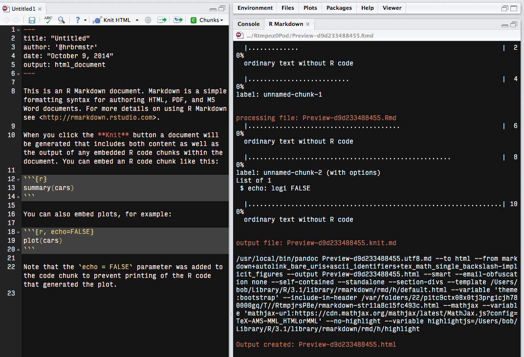 下面是knit2html所做的工作(通过“Console”附近的"R“选项卡):