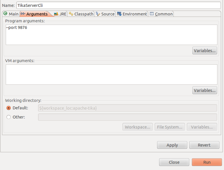 现在,在Tika的配置中,在程序参数框中,输入要给Tika的参数,例如--port 9876,如下所示