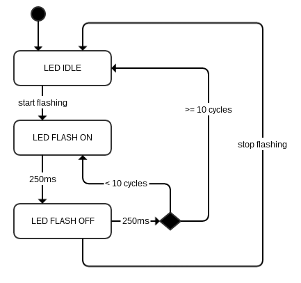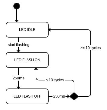 }请注意,按钮状态仅影响LED,如果它还没有闪烁,并且十个周期完成,即使按钮被释放。如果您希望在释放按钮时停止闪烁,那么start_flashing必须在LED_FLASH_OFF和可能的LED_FLASH_ON状态中进行测试,并导致早期返回到LED IDLE。例如: