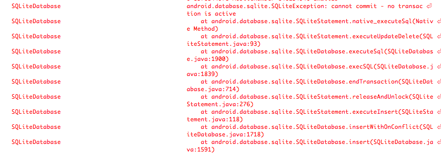 在我的安卓项目中,我面临的一个问题是database.The不能提交,无法提交,没有事务在sqlite中活动,如何清除这个错误并消除it.What是导致这个错误的原因,并且当我试图用超过5-8组数据更新我的表时,有一件事意味着应用程序崩溃了,而在logcat中,这条消息是coming.And,我附加的错误屏幕截图是logcat的输出。