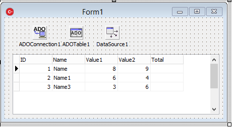 ADOTable1->FieldByName("Total")->AsInteger = a + b;