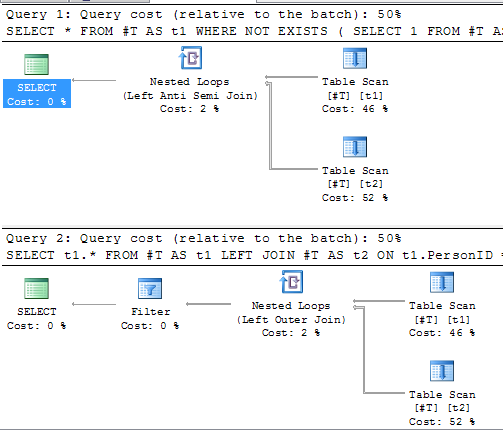 WHERE t2.PersonID IS NULL;比较这两个方案,您可以在顶部计划中看到反半连接,但是在下面的计划中会出现一个普通的连接,然后是一个过滤器: