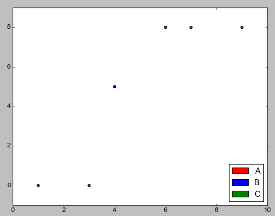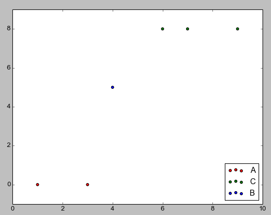 还有第二种创建图例的方法,在这种方法中,您可以为一组点指定“标签”,对每个集合使用一个单独的分散命令。这方面的一个例子如下。