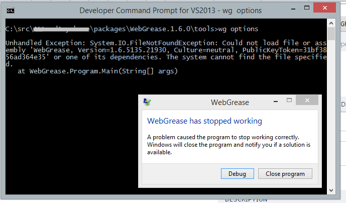 我试图通过命令行使用WebGrease 1.6 (也尝试了VS2013的Developer命令提示符)。当我运行"wg options“时,我会得到以下错误(随附屏幕截图)