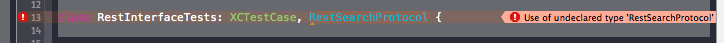 顺便提一句,如果我把RestInterfaceTests类放在RestInterface.swift的末尾,它似乎找到了协议,但是XCTestCase现在还没有声明。
