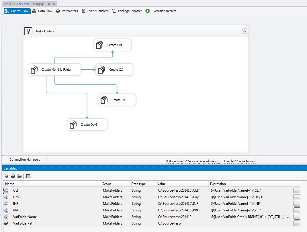 @[User::VarFolderPath]+RIGHT("0" + (DT_STR, 4, 1252) DATEPART("yy" , GETDATE()), 4) + (DT_STR, 2, 1252) DATEPART("mm" , GETDATE())然后在VarFolderName中创建其他四个文件夹: CLI、Day3、INF、PRI。一切都在起作用