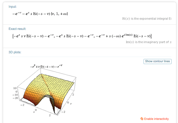 然而,您的投入在股息中有一个sv。Wolfram将其理解为s*v,这可能不是您的意思--如果sv是一个独立的变量,我建议您将它重命名为s或其他什么东西。问题是,如果s确实是一个变量,如果您看一下答案中的图,由于-∞项,似乎有一个脊,所以对于s的某些值,脊可能在你的积分曲线内,然后积分就无法计算,正如Bill在他对你的问题的评论中指出的。