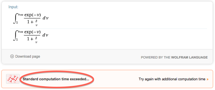 正如您在上面图片左下角突出显示的部分中所看到的,Wolfram没有完成您的请求,因为它超过了标准的计算时间。这是因为他们需要为Wolfram用户提供一些额外的功能来支付服务费用。其中一个特性是。