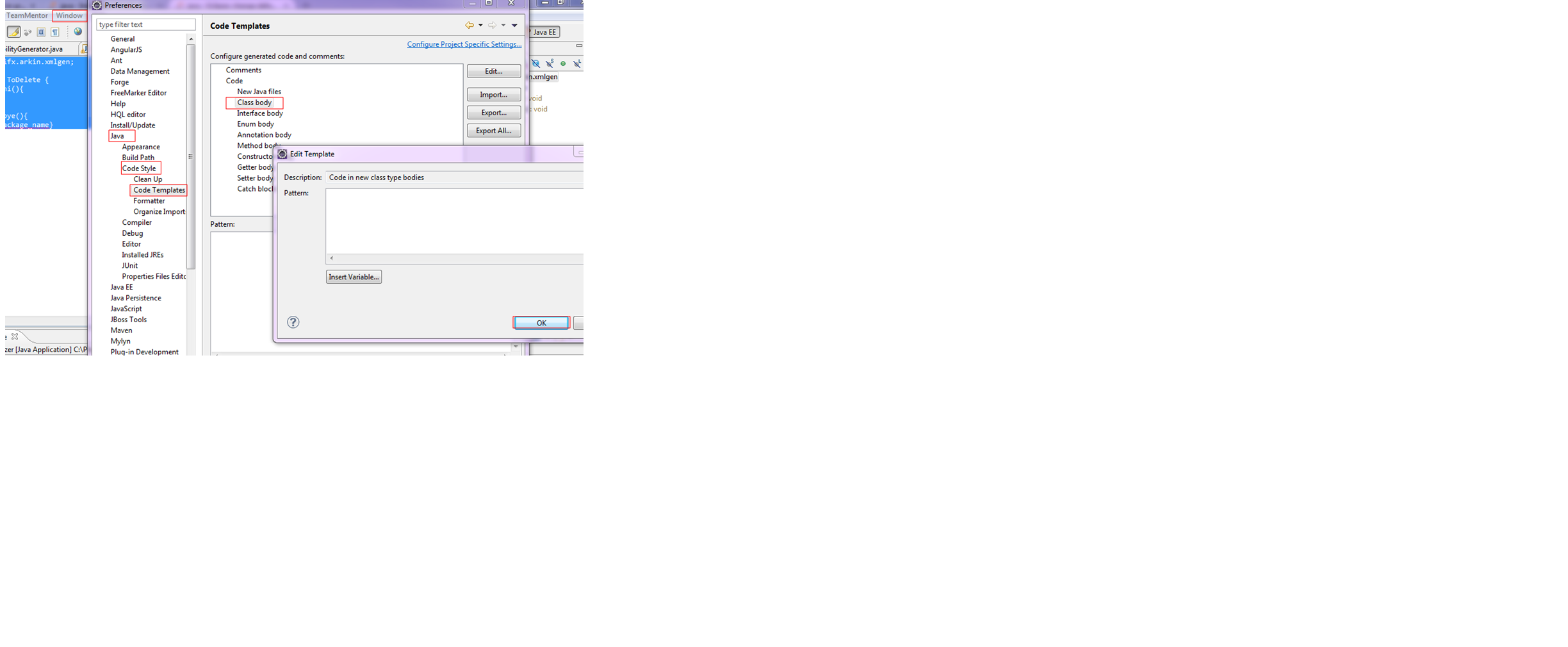 选择window -> Preferences,然后Preferences窗口将是opened.From窗口的左侧,通过单击它展开"java“选项。然后点击"CodeStyle“选项。然后选择“代码模板”选项。您可以在窗口顶部的正确位置找到“配置生成的代码和注释”框。通过选择“代码”选项展开。然后您可以找到模板列表。选择一个要更改的模板,然后单击“编辑”按钮。然后,“编辑模板”窗口将被打开,在那里你可以定义模式,点击“确定”按钮和“应用”按钮。