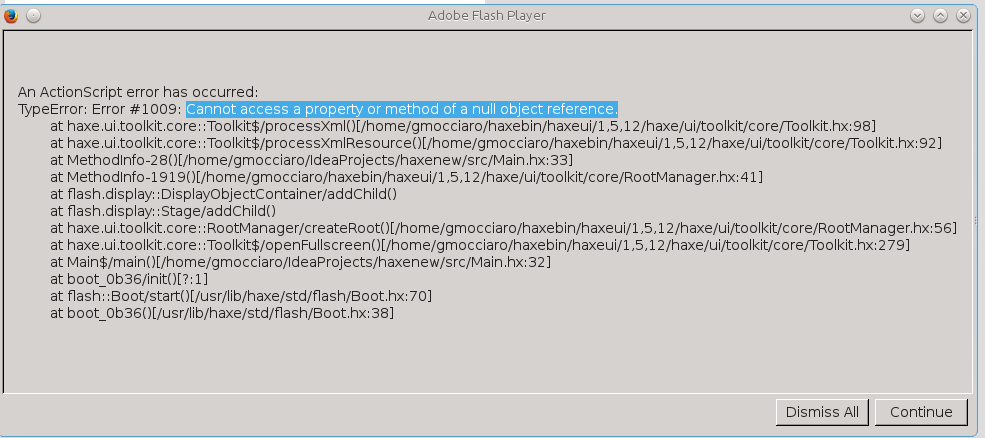 我试图用Haxe和HaxeUI复制这个HaxeUI。当我编译项目时,一切看起来都很好,但是当我试图从浏览器执行swf时,我遇到了一个错误,比如:Cannot access a property or method of a null object reference引用了processXmlResource (根文件夹中有main.hx,子文件夹中有main.hx)。