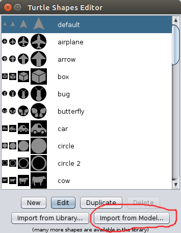 话虽如此,您仍然可以在另一种型号中导入您的龟形。只需保存在某个地方创建形状的模型,打开要在其中导入形状的模型,然后使用Turtle编辑器中的Import .按钮从原始模型导入形状: