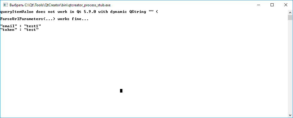 qDebug() << "queryItemValue does not work in Qt 5.9.0 with dynamic QString" << query.queryItemValue("token") << "("<< endl;