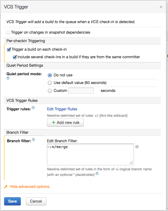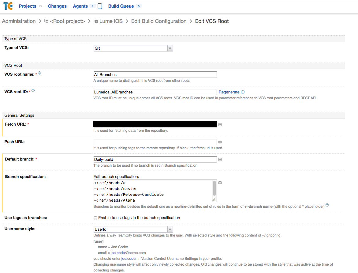 我目前正在尝试设置TeamCity来构建不是我团队主要分支的所有分支。我很难让它正常工作,并且只让它与默认的分支一起工作。我们的存储库有以下分支: master、Daily-build、分支-Alex和其他具有类似名称的分支。我非常希望这个构建配置能够在不包括主程序的推送上运行。以下是我的配置的一些图片: