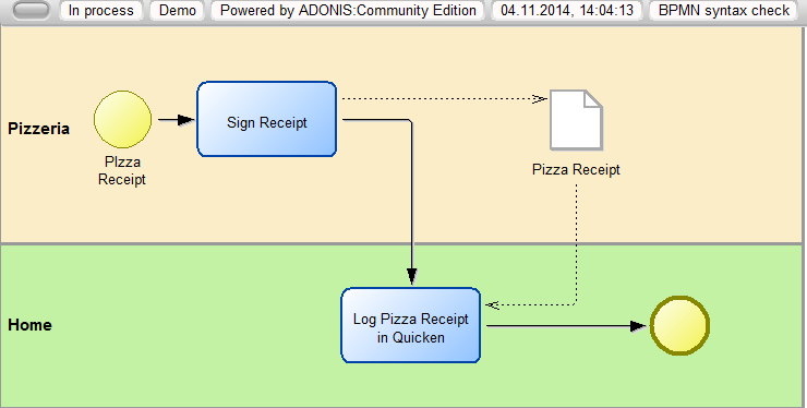 在BPMN中显示数据对象是一种可选的方法。这意味着,您可能决定显示重要的方面,但不需要显示所涉及的所有数据:仅仅因为您没有显示某个方面,这并不意味着它不存在。此外,您可以只显示更改的点(类似于create/update/delete) (通过显示指向数据对象的关联)以及仅显示消耗点(read) (通过显示来自数据对象的关联)。