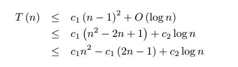 如果T(n)<=T(n-1) +c log对某些c => T(n) <= T(n-2) +c log (n-1) +c log n => T(n) <= T(n-3) +c log(n-2) +c log(n-1) +c log n 因此: T(n) <= T(0) + sum_{i=1 .n} c log I= O(n log n) 但O(n^2)也是对的,但不那么具体,因为T(n) = O(n^2)是指 有一些a,m使得T(n)<=a n^2适用于所有n>=m