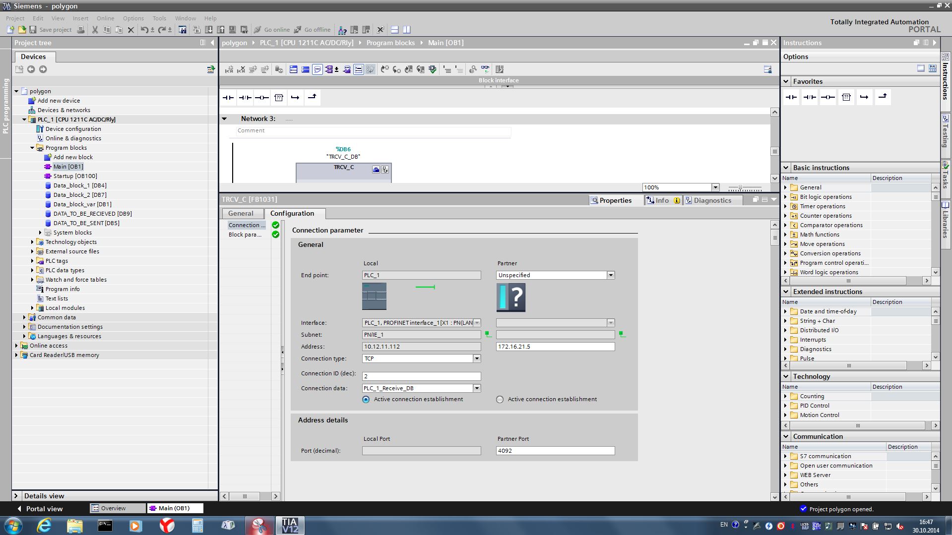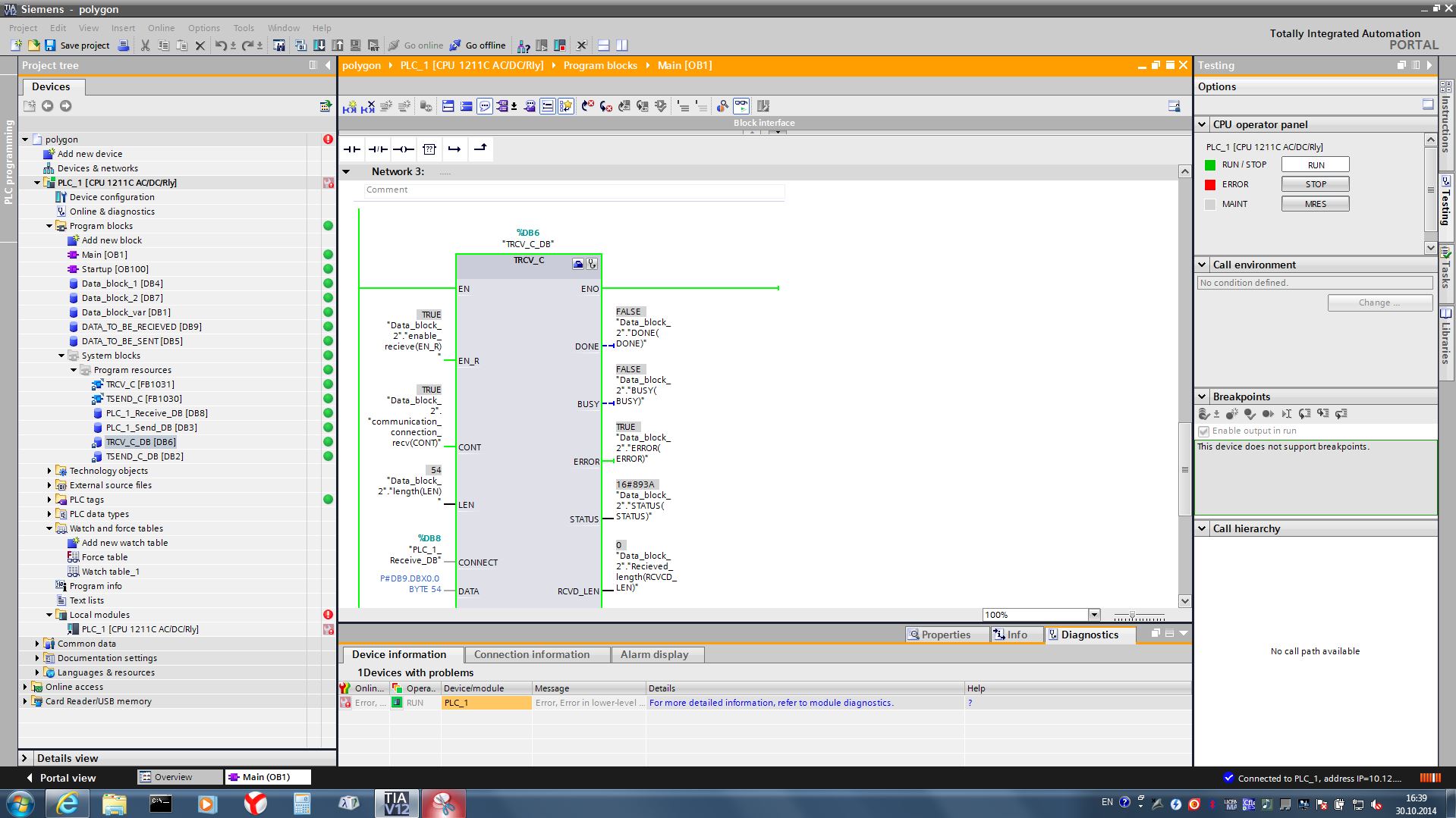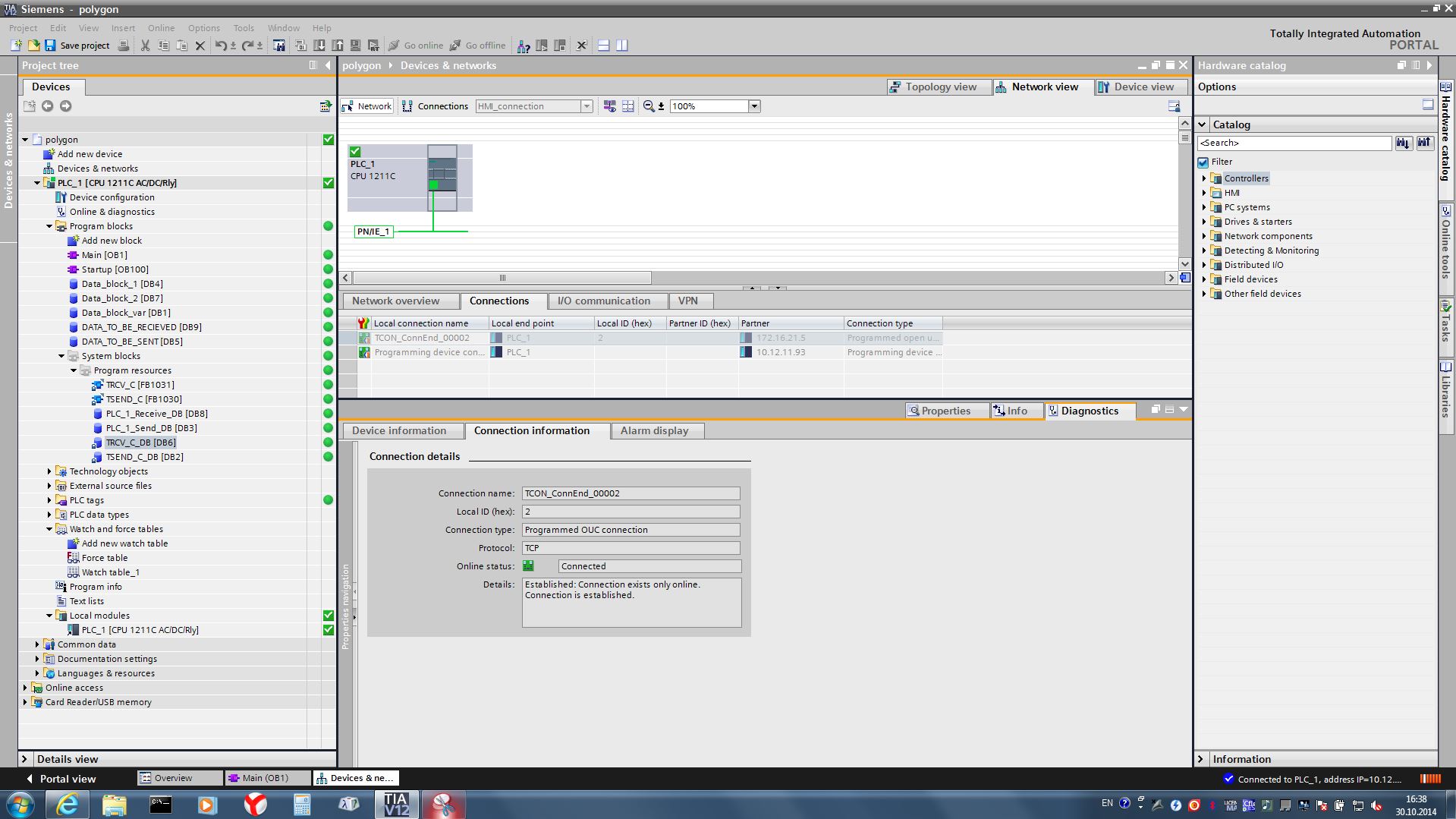 请帮助解决PC与1211 C之间的通信建立问题(6ES7-211-1BD30-0XB0固件:v2.0.2)。我觉得我在某个地方犯了一个愚蠢的错误,但我不知道它到底在哪里。所以,我使用函数TRCV_С.