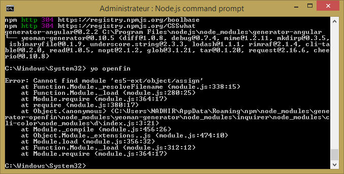 检查es5-ext包是否存在于某些node_modules文件夹中,这些文件夹从错误堆栈跟踪中提到的路径中的color\node_模块开始。