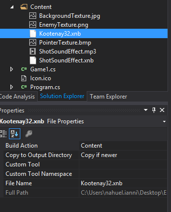 我已经在project_name/Content,中获得了.spritefont文件--它列在解决方案资源管理器中,我正在用以下行加载它: