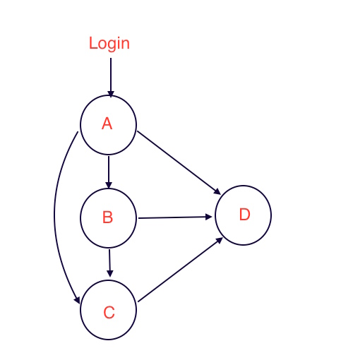 我的应用流程如下所示,其中A、B、C和D是视图控制器。箭头标记显示从和查看控制器。