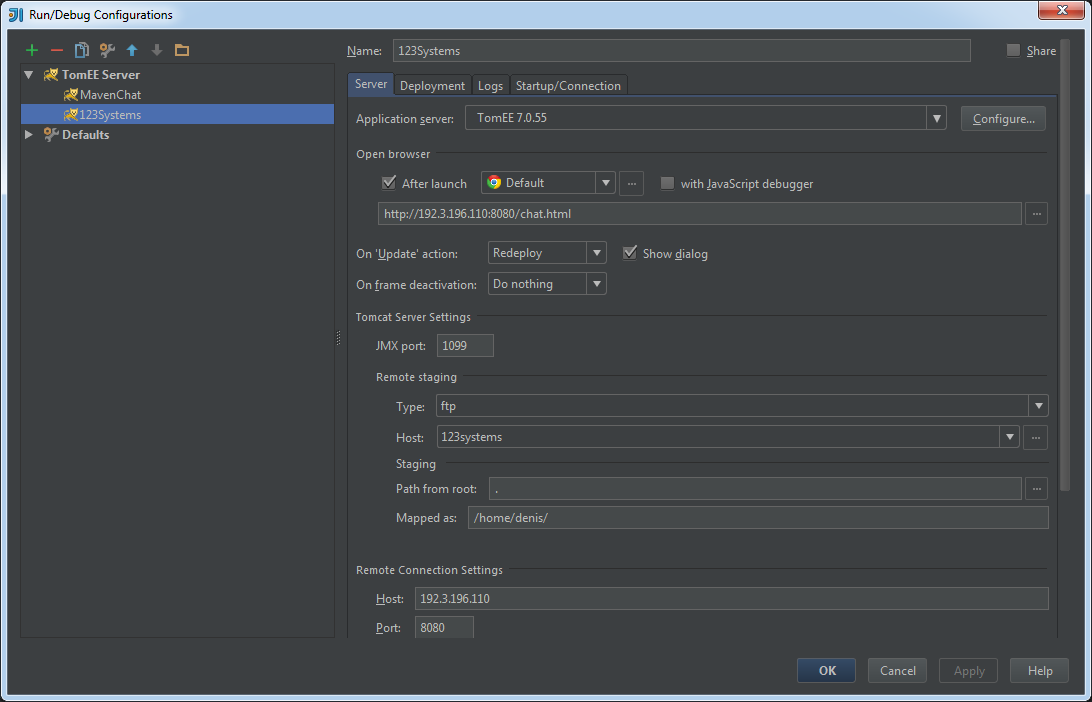 好的,我无法配置它,但是我可以使用maven将我的应用程序部署到我的远程服务器上!我跟踪了本手册,它起作用了!