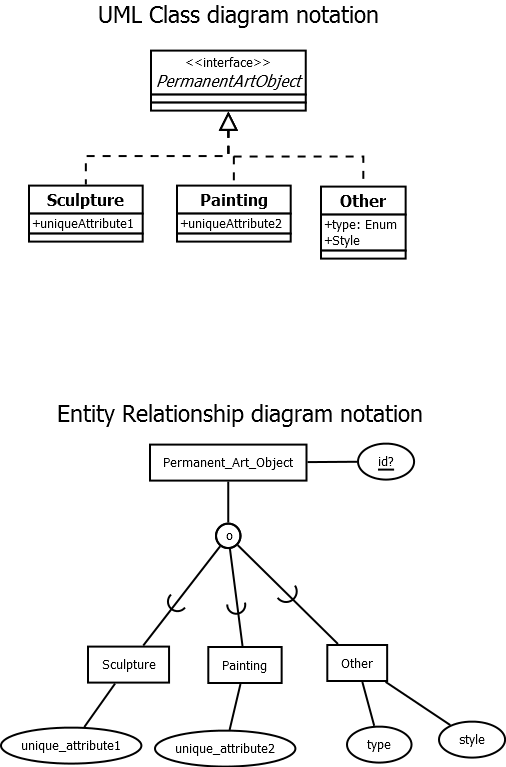 我正在描绘一个艺术博物馆系统,其中有Permanent_Art_Objects。每个Permanent_Art_Object都有许多属性,也可以是Sculpture/Statue、Painting或Other。这取决于它是一个雕塑/雕像,绘画,或其他,它有自己独特的子属性。