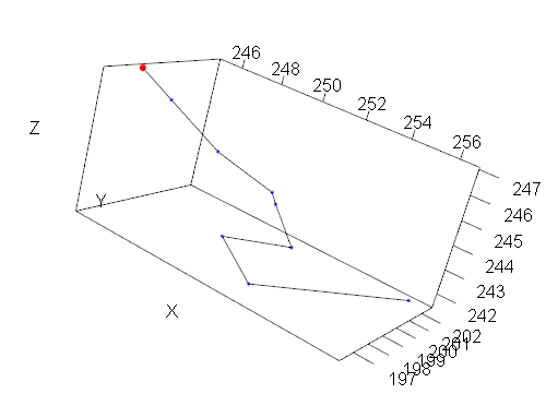title3d(xlab="X",ylab="Y",zlab="Z")此代码生成数据的可旋转3D图。下面是屏幕截图。红点是起点。