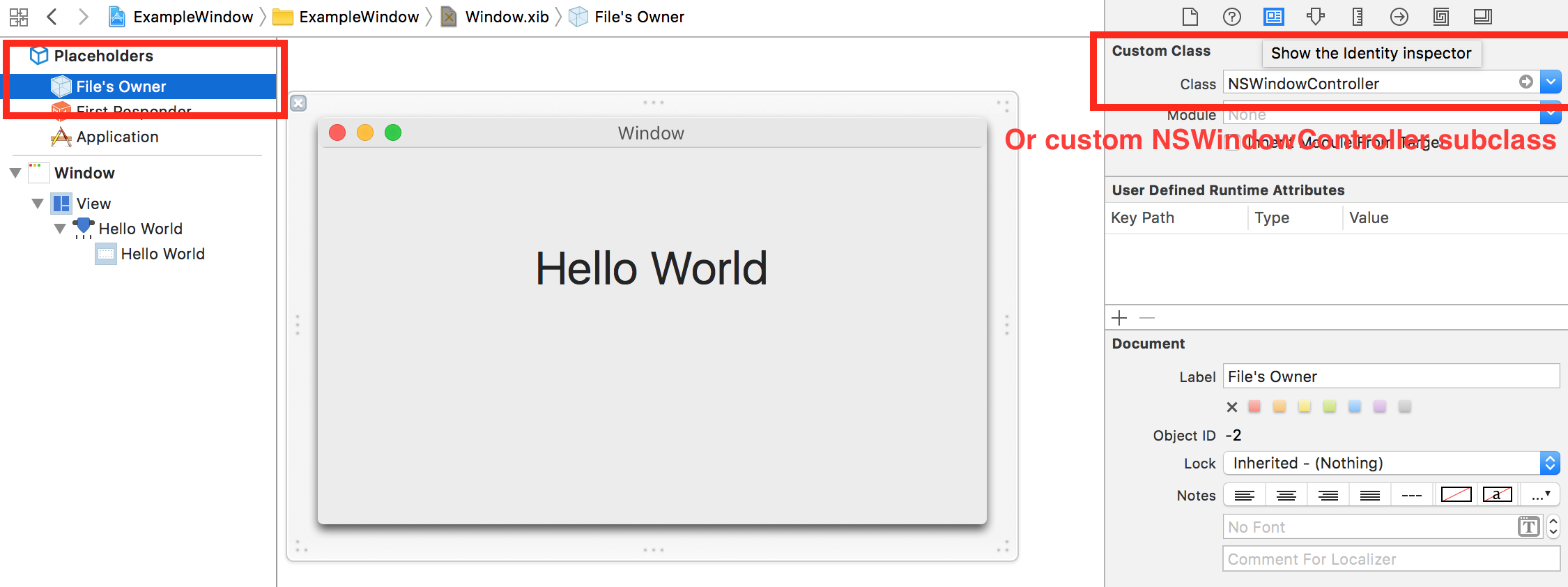 2.选择“文件所有者”并将其设置为NSWindowController或其子类。