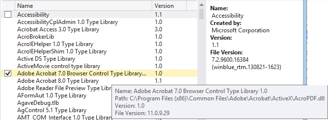 除了从命令行运行AxImp.exe之外,正确的方法是右键单击工具箱,选择“选择项”。选择COM组件选项卡并选择"Adobe阅读器“。现在可以将添加的控件拖到窗体上。这样做后,您现在将获得两个互操作库引用添加到您的项目中。AcroPDFLib,和你以前一样。以及负责控制的包装器AxAcroPDFLib。