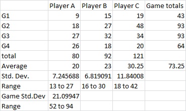 我进一步假设,给出的四个数字是四场比赛的数字,平均73.25是三名球员在这四场比赛中得分的平均数。所以我的想法是,要得到三个玩家的平均标准差,你就可以得到游戏总数的标准差。这将给出一个21秒的标准差。这意味着你可以预测三位玩家在一场比赛中的积分将在52分到94分之间。(请注意,第一场比赛对三名球员加在一起,以及对A和B个人来说,都是一场离群的比赛。)