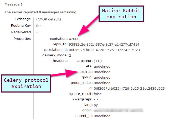 另一方面,芹菜允许您在秒内或作为日期时间设置expires参数(https://docs.celeryproject.org/en/stable/reference/celery.app.task.html)。与本机RabbitMQ功能的不同之处在于,消息过期后仍保留在队列中。将过期消息传递给工作人员,然后员工读取过期标头,以确定消息已过期并拒绝该消息。