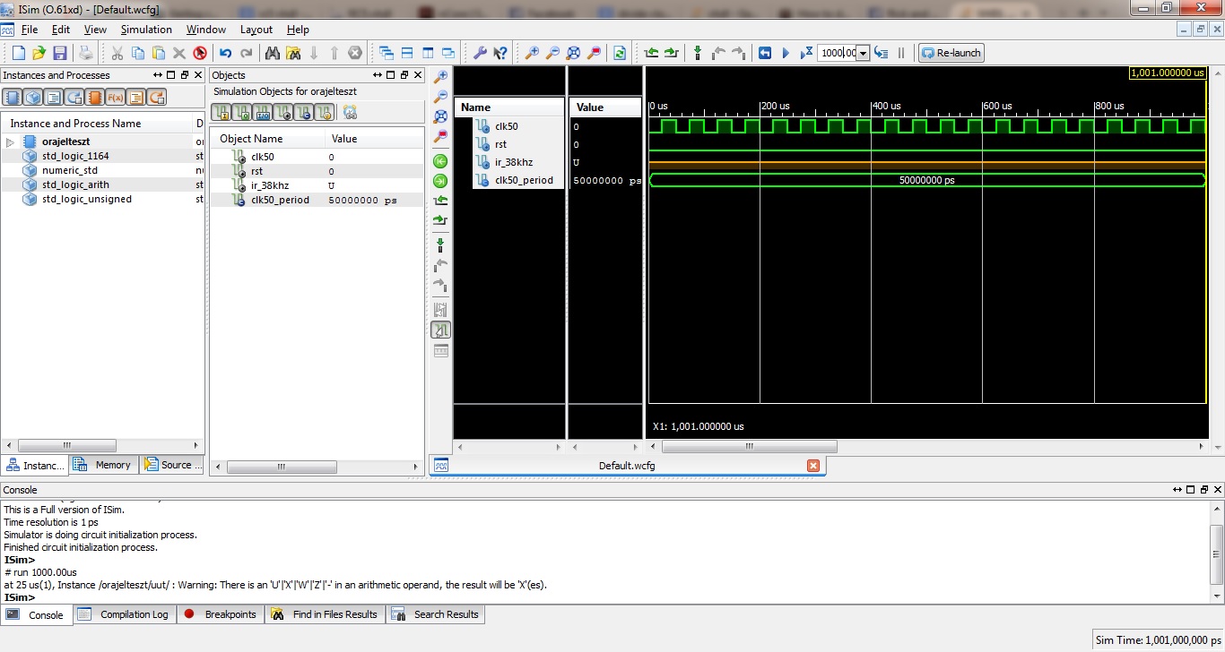 我对这段代码有意见。理论上,它应该将我的50兆赫信号转换为36 the,但是当我运行模拟时,结果是ir_38khz没有得到任何未分配的值。