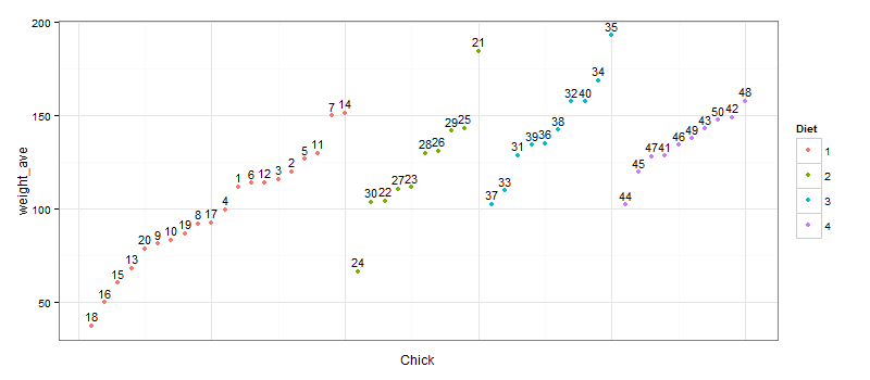有一个问题我需要解决:使用R包中的ChickWeight数据,计算每个小鸡的平均重量。然后根据每餐的重量点上鸡肉。然后用不同的颜色来划分这些有序的体重,这样每一种饮食,小鸡的顺序就从最低到最高。对于数据符号,请使用Chick标识。