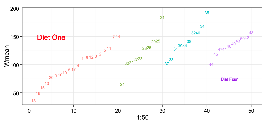 a$Diet = c(rep(1, 20), rep(2, 10), rep(3, 10), rep(4, 10))