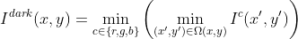 如果我正确地理解了这个方程要求的内容,您实际上是在提取图像中每个(x,y)中心的像素块,您将为红色、绿色和蓝色通道确定这个像素块中的最小值。这将产生3个值,其中每个值是每个通道像素块内的最小值。从这3个值中,您可以选择其中的最小值,这是图像中位置(x,y)的最终结果。