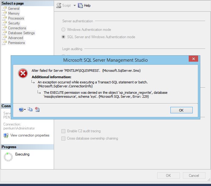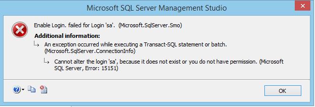 我自言自语地想,sa账户可能有问题。我开启了2012年的SSMS。在sa帐户上有一个向下的红色箭头。每当我试图更改登录状态时,它都会打开一条错误消息:
