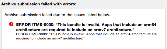 当我第一次验证它通过的构建时,事情就更奇怪了。然后,当我试图提交时,出现了一个错误。当我再次尝试验证相同的构建时,我得到了一个错误。当我再次使用完全相同的设置存档时,新存档的验证也不起作用。