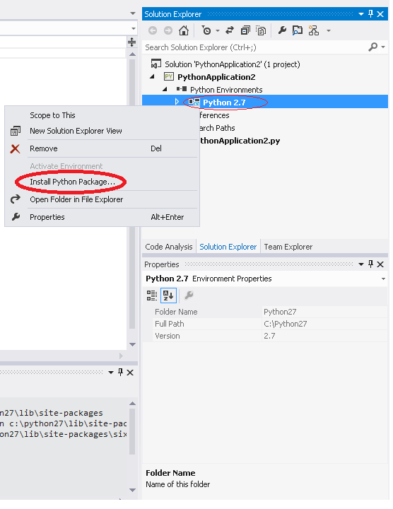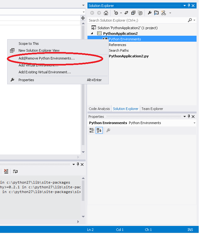 选择您的python项目。从项目解决方案资源管理器中添加python环境,右键单击它并选择"Add /.“。将出现一个带有复选框的窗口,选择您当前的python版本(安装在您的系统中)。