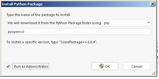 窗口与pip和easy_install选项一起上升。现在,只需键入您的包名例如。比目斯。以管理员身份检查运行。单击确定按钮