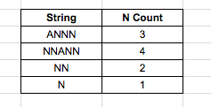 =ArrayFormula(LEN(REGEXREPLACE(A2:A6, "[^N]", "")))在B2中,应该输出整个范围的N计数。