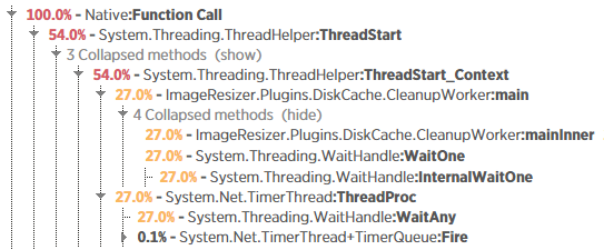 看起来,与ImageResizer的DiskCache插件相关的清理例程在与此应用程序相关的高CPU消耗中占很大比例。我们启用了autoClean,但如果没有,则配置为使用缺省值,我认为对于大多数典型情况来说,这是最优的: